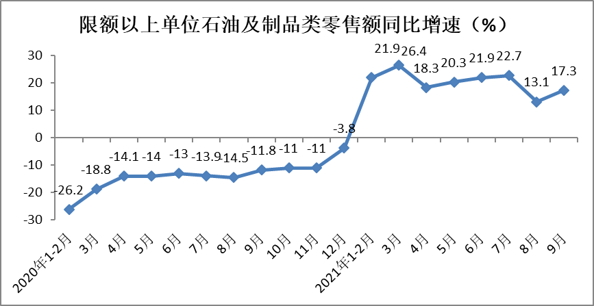 前三季度,限额以上单位石油及制品类零售额实现14900亿元,同比增长20.3%,增速较1-8月份放缓0.4个百分点。9月份,限额以上单位石油及制品类零售额同比增长17.3%,增速较8月份加快4.2个百分点。