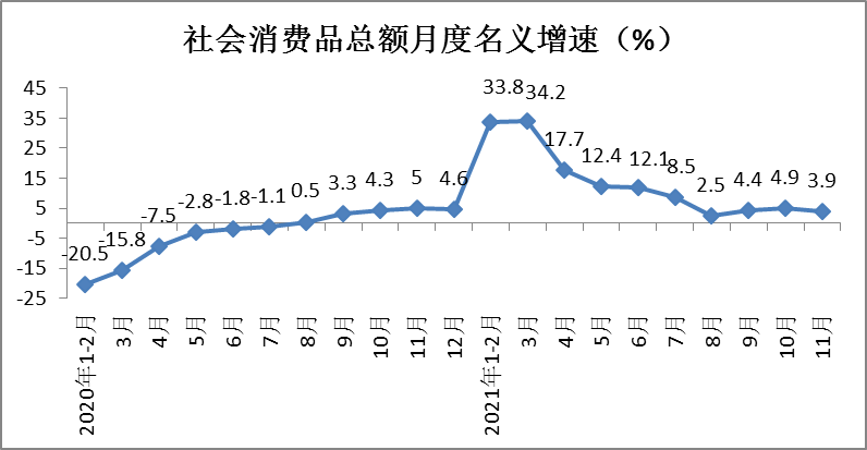 11月份,社会消费品零售总额41043亿元,同比增长3.9%,比2019年11月份增长9.0%,两年平均增长4.4%。