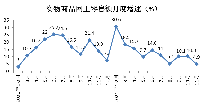 1-11月,实物商品网上零售额实现98056亿元,同比增长13.2%,增速较1-10月放缓1.4个百分点,低于社会消费品零售总额增速0.5个百分点。实物商品网上零售额占社会消费品零售总额的比重为24.5%,相比1-10月提升了0.8个百分点。其中,吃类、穿类和用类商品分别增长18.8%、11.1%和13.1%。经测算,11月份实物商品网上零售额实现13077亿元,同比增长4.9%,是今年以来的最低月度增长水平。