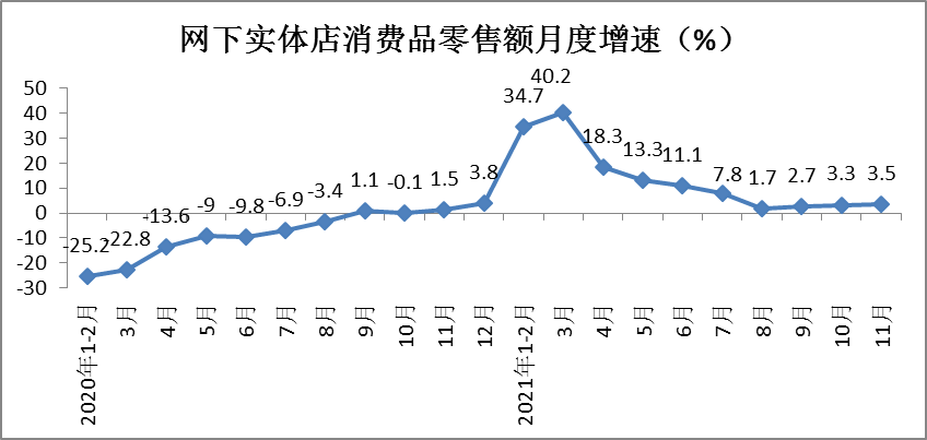根据测算,1-11月份实体店零售额实现301498亿元,同比增长13.9%,增速较1-10月放缓1.1个百分点。11月份实体店消费品零售额27966亿元,同比增长3.5%,增速较10月份加快0.2个百分点。