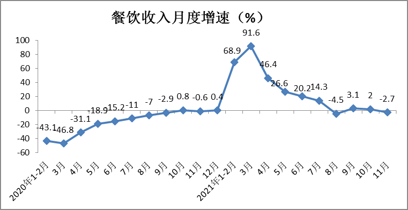 1-11月,餐饮收入实现42054亿元,同比增长21.6%,增速较1-10月放缓4.1个百分点。其中,限额以上单位餐饮收入9413亿元,同比增长26.7%,增速相比1-10月放缓3.7个百分点。