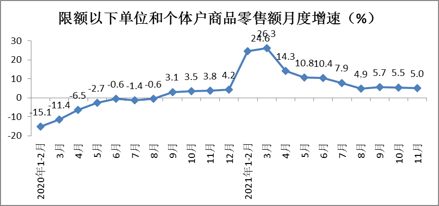 根据测算,1-11月限额以下商品零售额219398亿元,同比增长11.9%,增速较1-10月放缓0.9个百分点,增速低于同期整体商品零售0.9个百分点;对商品零售额增长贡献率为57.7%,占商品零售额比重为61.4%。其中,11月份限额以下商品零售额21049亿元,同比增长5.0%,对商品零售额增长贡献率为60.6%,占商品零售额比重为58.1%。