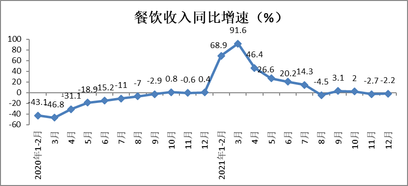 12月份,餐饮收入4841亿元,同比下降2.2%,降幅较11月份收窄0.5个百分点。其中,限额以上单位餐饮收入985亿元,同比下降0.1%,降幅较11月份收窄0.2个百分点。