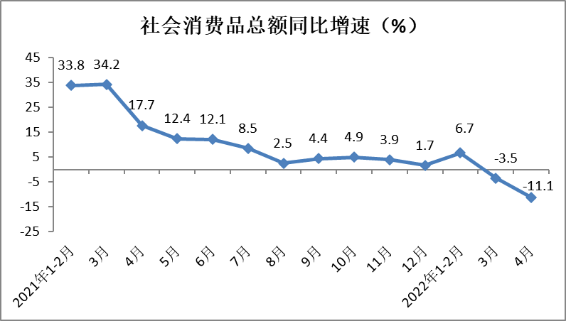 1-4月份,社会消费品零售总额实现138142亿元,同比下降0.2%,增速较一季度下降3.5个百分点。其中,4月份社会消费品零售总额同比下降11.1%,是自2020年4月份以来的最低增速。4月份社会消费品零售总额实现29483亿元,较2019年4月份缩小1103亿元,市场规模低于疫情前水平。