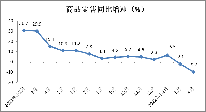 根据乐鱼电竞统计数据,2022年1-4月份全国百家重点大型零售企业商品零售额同比下降14.2%,降幅较一季度扩大5.6个百分点,其中4月份零售额同比下降35.7%。从各类商品销售情况来看,1-4月份粮油、食品类零售额同比下降6.6%,金银珠宝类零售额同比下降9.5%,降幅相对较低。