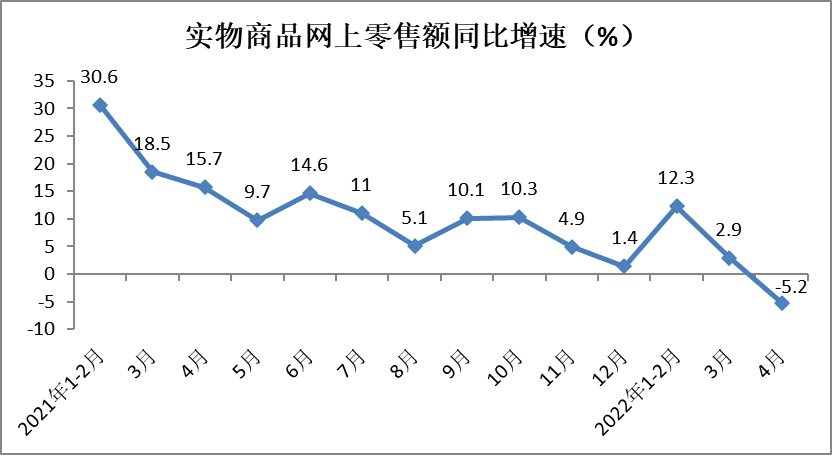 1-4月份,实物商品网上零售额实现32887亿元,同比增长5.2%,增速较一季度放缓3.6个百分点,占社会消费品零售总额的比重为23.8%,其中,吃类、用类商品分别增长12.9%、6.3%,穿类下降1.7%。4月份实物商品网上零售额同比降低5.2%,首次出现负增长情况。