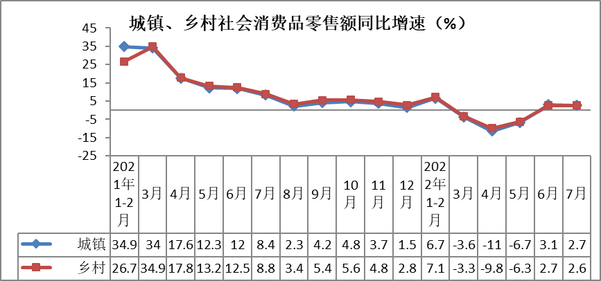 1-7月份,乡村消费品零售额32391亿元,同比增长0.1%,增速较上半年提高0.4个百分点,实现正增长。城镇消费品零售额213910亿元,同比下降0.3%,降幅较上半年收窄0.5个百分点。7月份,城镇消费品零售额同比增长2.7%,增速较上月放缓0.4个百分点,乡村消费品零售额同比增长2.6%,增速较上月放缓0.1个百分点。