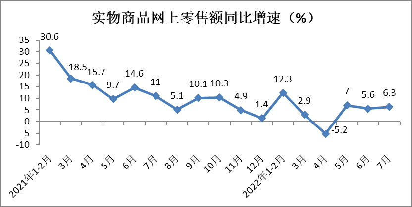 1-7月份,实物商品网上零售额实现63153亿元,同比增长5.7%,增速较上半年加快0.1个百分点,占社会消费品零售总额的比重为25.6%,占比较上半年下降0.3个百分点。在实物商品网上零售额中,吃类增长15.7%,增速与上半年持平;穿类增长3.4%,增速较上半年加快1个百分点;用类增长5.0%,增速较上半年放缓0.1个百分点。7月份实物商品网上零售额同比增长6.3%,增速较上月加快0.7个百分点。