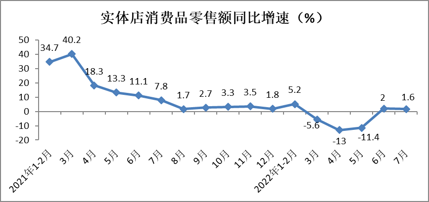 1-7月份,实体店消费品零售额实现183149亿元,同比下降2.1%,降幅较上半年收窄0.6个百分点。7月份实体店消费品零售额同比增长1.6%,增速较上月放缓0.4个百分点。