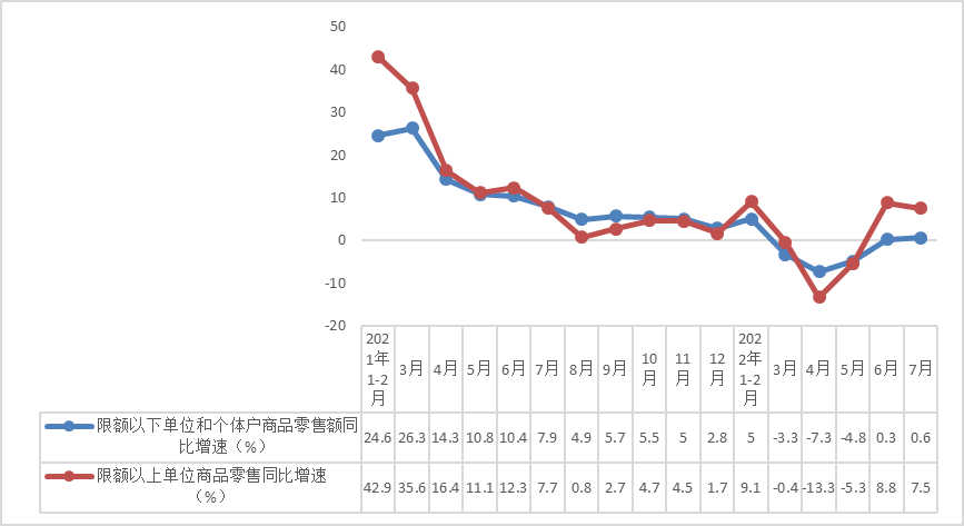 据测算,1-7月份,限额以下单位和个体户商品零售额133665亿元,同比下降0.7%,降幅较上半年收窄0.1个百分点。其中,7月份,限额以下单位和个体户商品零售额同比增长0.6%,增速较6月份提高0.3个百分点,低于限额以上单位商品零售额增速6.9个百分点。