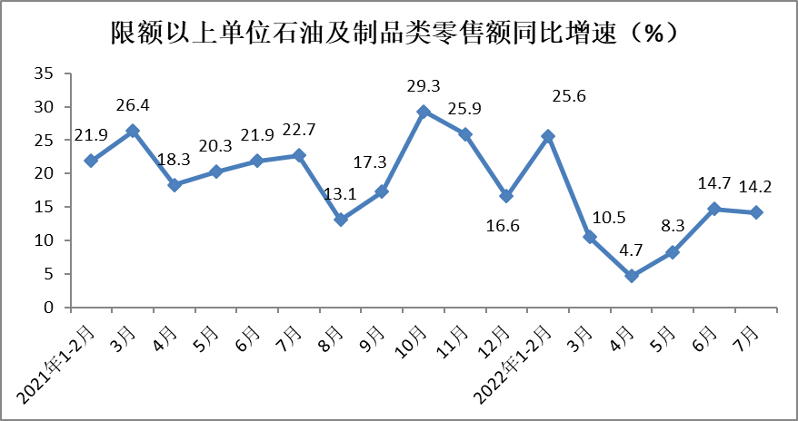 1-7月份,限额以上单位石油及制品类零售额实现13068亿元,同比增长14.2%,增速较上半年放缓0.5个百分点。7月份限额以上单位石油及制品类零售额同比增长14.2%,增速较上月放缓0.5个百分点。