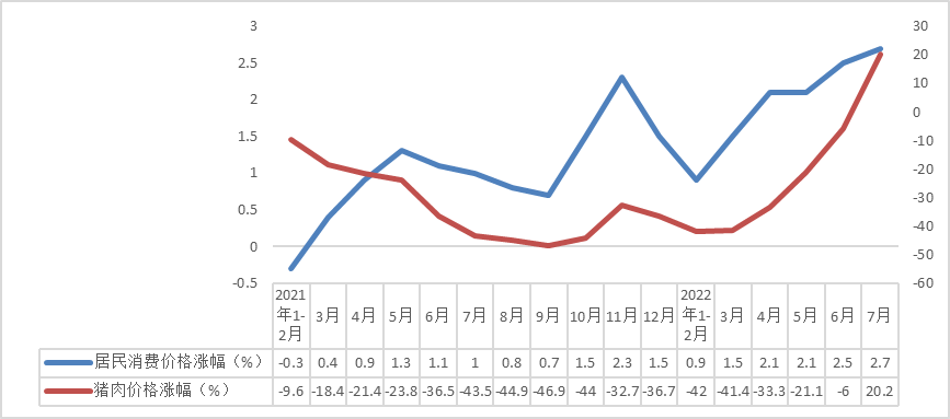 1-7月份,全国居民消费价格同比上涨1.8%,涨幅较上半年提高0.1个百分点,较上年同期提高1.2个百分点。其中,7月份,猪肉价格同比上涨20.2%,推动全国居民消费价格同比上涨2.7%,涨幅较上月加快0.2个百分点,较上年同期提高1.7个百分点。尽管7月份猪肉价格上涨较快,但市场供求关系依然稳定,猪肉价格大幅上涨可能性不大,居民消费价格整体平稳可控。