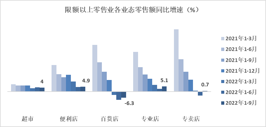 6、前三季度专业店、便利店、超市、专卖店零售额实现正增长