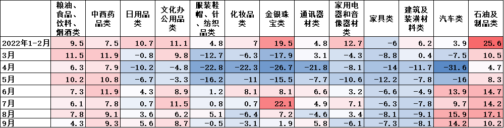 9、汽车、石油及制品消费保持较快增长