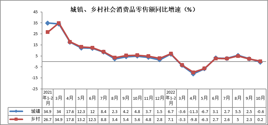 10月份,城镇消费品零售额同比下降0.6%,增速环比回落3.1个百分点。乡村消费品零售额同比增长0.2%,增速虽环比回落2.1个百分点,但快于城镇消费0.8个百分点。1-10月份,城镇消费品零售额312649亿元,同比增长0.5%,增速较前三季度放缓0.2个百分点。乡村消费品零售额47926亿元,同比增长0.8%,增速较前三季度放缓0.1个百分点,但快于城镇消费0.3个百分点。