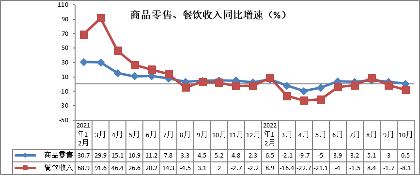 10月份,商品零售额同比增长0.5%,增速环比回落2.5个百分点。餐饮收入同比下降8.1%,降幅环比扩大6.4个百分点。1-10月份,商品零售实现325227亿元,同比增长1.2%,增速较前三季度放缓0.1个百分点。餐饮收入实现35348亿元,同比下降5%,降幅较前三季度扩大0.4个百分点。