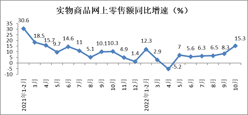 10月份,实物商品网上零售额同比增长15.3%,增速环比大幅加快7个百分点。1-10月份,全国实物商品网上零售额实现94506亿元,同比增长7.2%,增速较前三季度加快1.1个百分点。网上消费占比持续提升,1-10月份,实物商品网上零售额占社会消费品零售总额的比重为26.2%,占比较前三季度提高0.5个百分点。