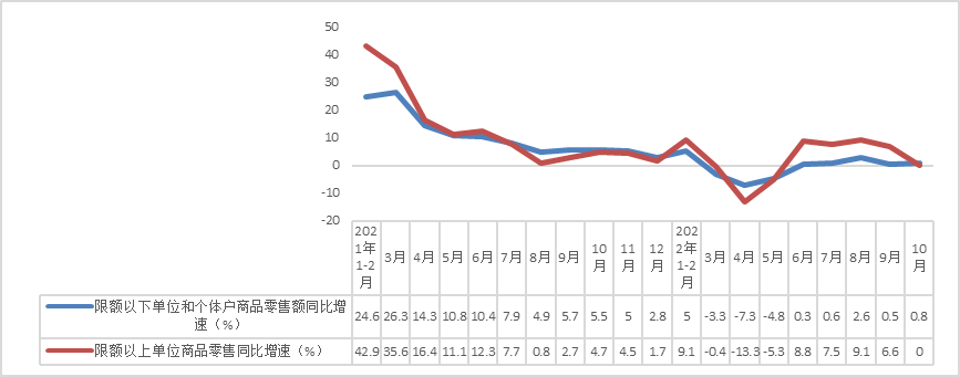 据测算,10月份,限额以下单位和个体户商品零售额同比增长0.8%,增速环比提高0.3个百分点,高于限额以上单位商品零售额增速0.8个百分点。1-10月份,限额以下单位和个体户商品零售额195943亿元,与上年同期持平,增速较前三季度回升0.1个百分点。