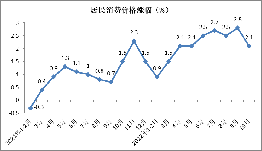 10月份,全国居民消费价格同比上涨2.1%,涨幅环比回落0.7个百分点,涨幅较上年同期扩大0.6个百分点。其中,10月份食品烟酒类价格同比上涨5.2%,涨幅环比回落1.1个百分点;居住类价格同比下降0.2%,增速环比回落0.5个百分点;交通和通信类价格同比上涨3.1%,涨幅环比回落1.4个百分点;医疗保健类价格同比上涨0.5%,涨幅环比回落0.2个百分点。1-10月份,全国居民消费价格温和上涨2%,涨幅与前三季度持平,较上年同期扩大1.3个百分点。