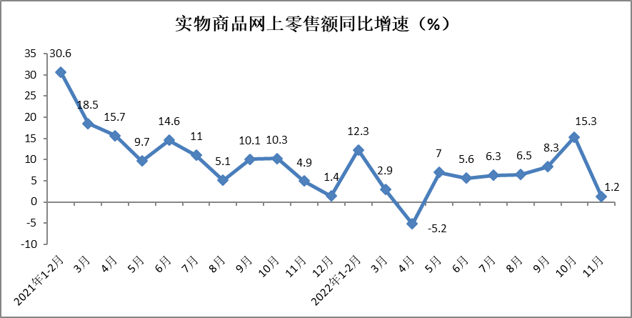 11月份,实物商品网上零售额同比增长1.2%,增速环比大幅回落14.1个百分点。1-11月份,全国实物商品网上零售额实现108098亿元,同比增长6.4%,增速较1-10月份放缓0.8个百分点。网上消费占比持续提升,1-11月份,实物商品网上零售额占社会消费品零售总额的比重为27.1%,占比较1-10月份提高0.9个百分点。