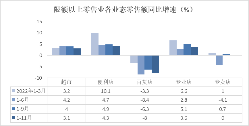 按零售业态分,1—11月份,限额以上零售业单位中的超市、便利店、专业店零售额同比分别增长3.1%、4.3%、3.6%,专卖店与去年基本持平,百货店下降8.0%。在实体店铺零售中,生活必需品供应更为集中、自助式消费较多的零售业态销售情况相对较好,其中,食杂店零售额增长3.5%,增速比限额以上单位商品零售额高1.4个百分点,仓储会员店零售额增长10.3%,增速比限额以上单位商品零售额高8.2个百分点。