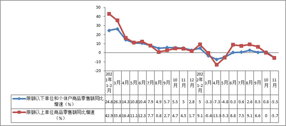 11月份市场销售承压主要是受疫情短期冲击影响,消费市场提质增效态势没有改变。随着进一步优化疫情防控措施的落地落实,《扩大内需战略规划纲要》等扩内需促消费政策逐步见效,居民消费需求潜力将不断释放,消费市场有望稳步恢复。
