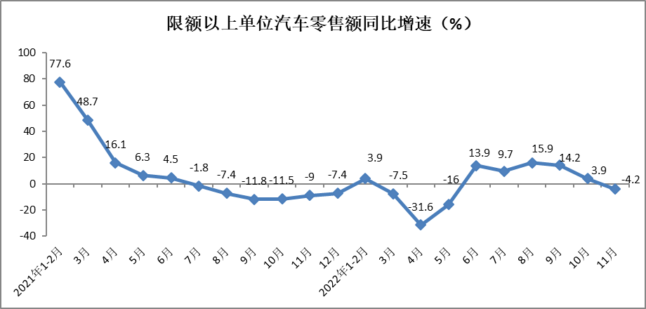 11月份限额以上单位汽车类零售额同比下降4.2%,增速环比回落8.1个百分点。1-11月份,限额以上单位汽车类零售额实现40700亿元,同比增长0.3%,增速较1-10月份回落0.5个百分点。