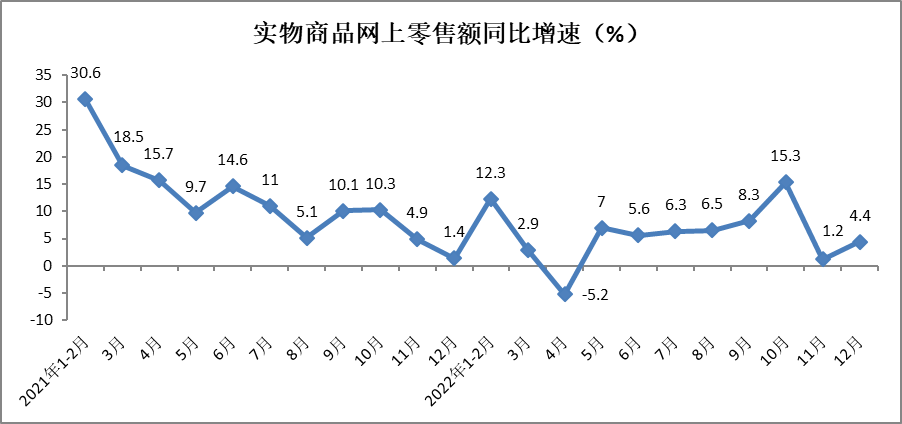 2022年12月份,实物商品网上零售额同比增长4.4%,增速环比加快3.2个百分点。2022年全年,全国实物商品网上零售额实现119642亿元,同比增长6.2%,增速较1-11月份放缓0.2个百分点。2022年全年,实物商品网上零售额占社会消费品零售总额的比重为27.2%,占比较1-11月份提高0.1个百分点。
