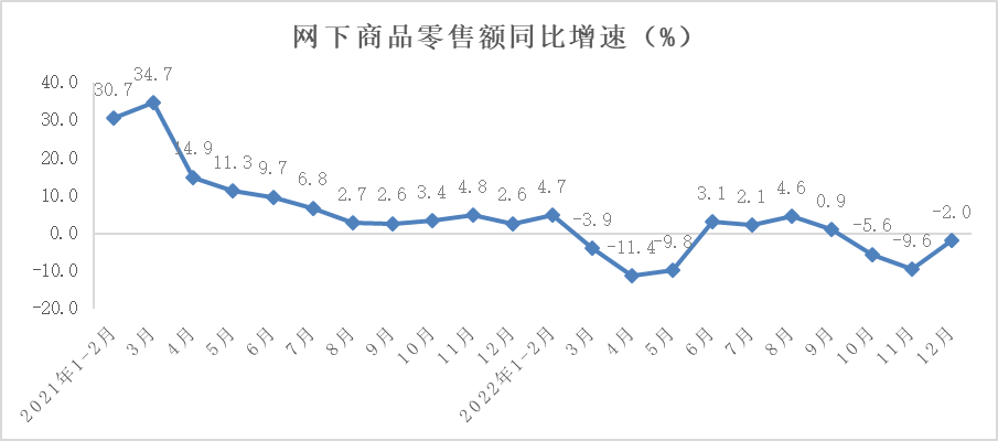 经测算,2022年12月份,网下商品零售额同比下降2%,降幅环比收窄7.6个百分点。2023年全年,网下商品零售额实现276150亿元,同比下降1.8%,降幅与1-11月份持平。