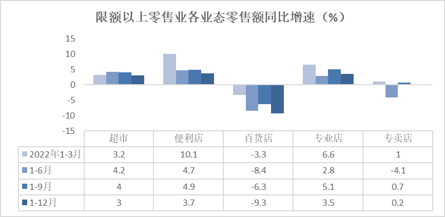按零售业态分,2022年全年,限额以上超市、便利店零售额同比分别增长3%、3.7%,增速较上半年放缓1.2和1个百分点。百货店零售额同比下降9.3%,降幅较上半年扩大0.9个百分点。专业店、专卖店零售额同比分别增长3.5%和0.2%,增速较上半年提升0.7和4.3个百分点。