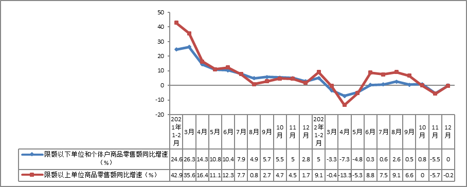 2022年12月份,社会消费品零售总额实现40542亿元,同比下降1.8%,降幅环比收窄4.1个百分点。2022年全年,社会消费品零售总额实现439733亿元,同比下降0.2%,降幅较1-11月份略微扩大0.1个百分点。
