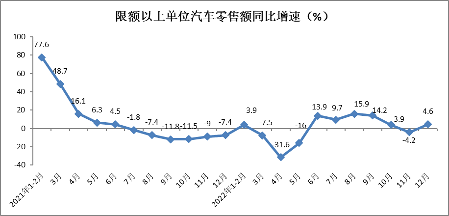 2022年12月份限额以上单位汽车类零售额同比增长4.6%,增速环比大幅提升8.8个百分点。2022年,限额以上单位汽车类零售额实现45772亿元,同比增长0.7%,增速较1-11月份提高0.4个百分点。