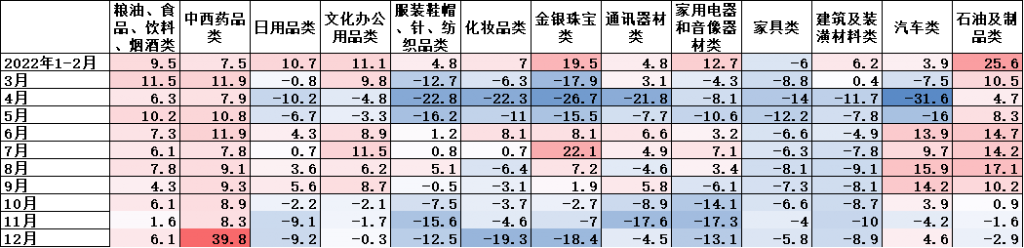 2022年12月份,限额以上单位商品零售中,中西药品类同比大幅增长39.8%,是增幅最大的商品品类。粮油食品、饮料烟酒类同比增长6.1%,增速环比加快4.5个百分点。文化办公用品类、服装鞋帽、针纺织品类、通讯器材类、家用电器类、建筑装潢材料类虽然低于上年同期,但降幅环比有所收窄。化妆品类、金银珠宝类降幅环比扩大相对明显,反映出线下消费场景亟需进一步修复。