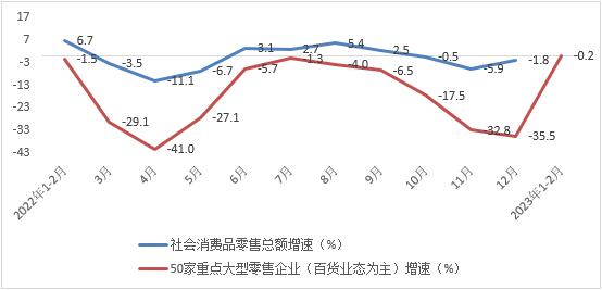 图 1? 2022年以来社会消费品零售总额及50家重点大型零售企业零售额增速