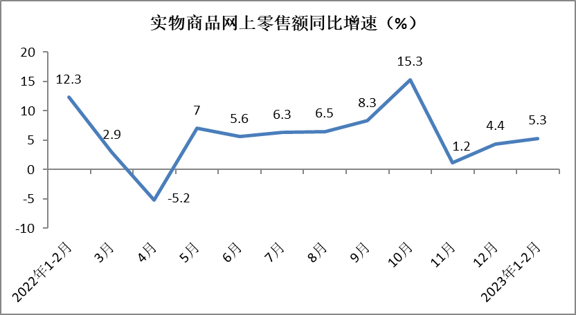 1-2月份实物商品网上零售额实现17476亿元,同比增长5.3%,增速较去年12月份加快0.9个百分点,占社会消费品零售总额的比重为22.7%。