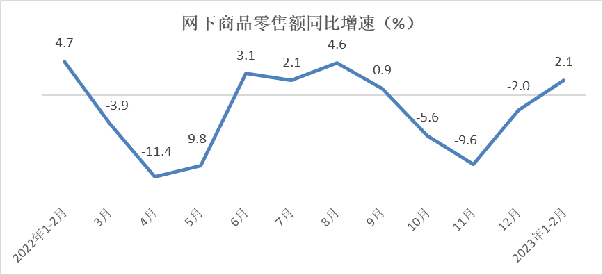 随着接触型、聚集型消费增多,网下商品零售额同比增速由负转正,实现自去年9月份以来的最快增速。根据测算,1-2月份网下商品零售额同比增长2.1%,增速较去年12月份提高4.1个百分点。