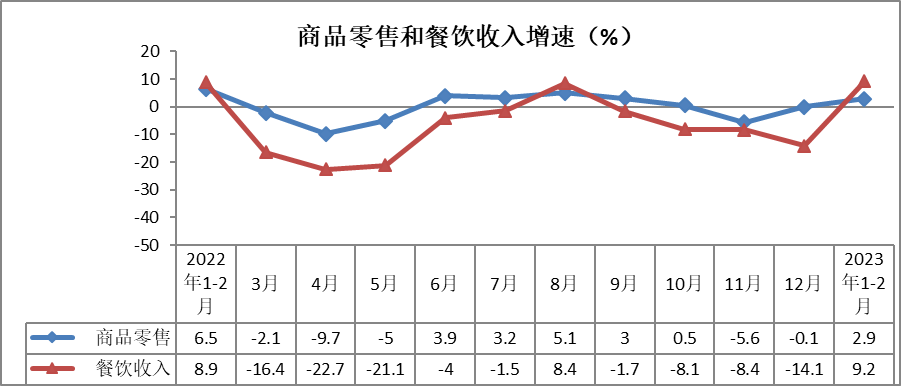 1-2月份商品零售68638亿元,同比增长2.9%,增速较去年12月份加快3.0个百分点。1-2月份餐饮收入8429亿元,同比增长9.2%,增速较去年12月份大幅提高23.3个百分点。