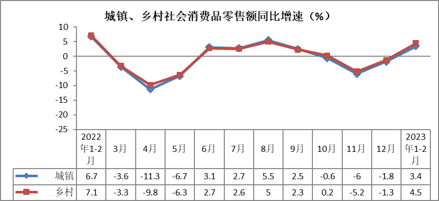 1-2月份城镇消费品零售额66796亿元,同比增长3.4%,增速较去年12月份提高5.2个百分点。乡村消费品零售额10271亿元,同比增长4.5%,增速较去年12月份提高5.8个百分点。1-2月份,乡村增速快于城镇1.1个百分点,实现较快增长。