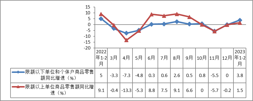 在疫情防控较快平稳转段,刺激消费政策落实显效,元旦、春节消费需求集中释放等有利因素推动下,1-2月份,社会消费品零售总额实现77067亿元,同比增长3.5%,增速自去年10月份首次转正,较去年12月份提高5.3个百分点。