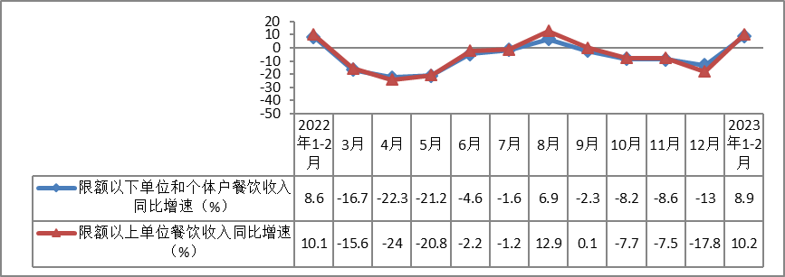 据测算,1-2月份限额以下单位和个体户餐饮收入实现6427亿元,同比增长8.9%,增速较去年12月份大幅提高21.9个百分点,但慢于限额以上单位餐饮收入增速1.3个百分点。
