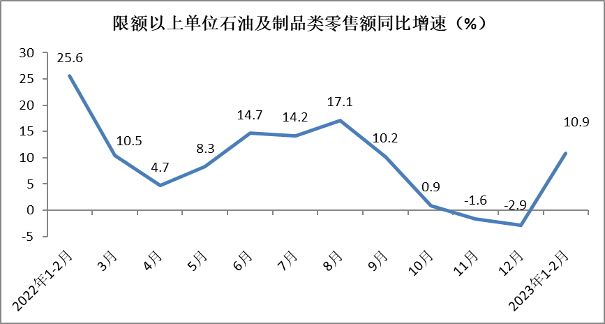 1-2月份限额以上单位石油及制品类零售额实现3881亿元,同比增长10.9%,增速较去年12月份大幅回升13.8个百分点。