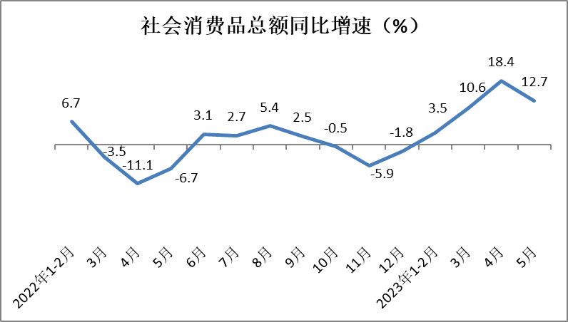 5月份,社会消费品零售总额实现37803亿元,同比增长12.7%,增速较4月份放缓5.7个百分点。1-5月份,社会消费品零售总额实现187636亿元,同比增长9.3%,增速较1-4月份提高0.8个百分点。