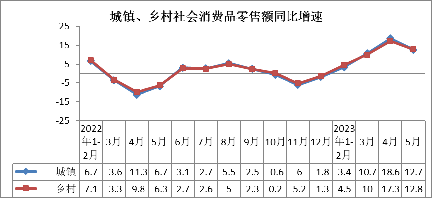 5月份,城镇消费品零售额实现32906亿元,同比增长12.7%,增速较4月份放缓5.9个百分点;乡村费品零售额实现4897亿元,同比增长12.8%,增速较4月份放缓4.5个百分点。