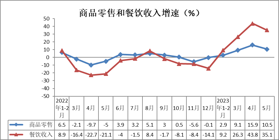 5月份,商品零售实现33733亿元,同比增长10.5%,增速较4月份放缓5.4个百分点。1-5月份,商品零售实现167678亿元,同比增长7.9%,增速较1-4月份加快0.6个百分点。