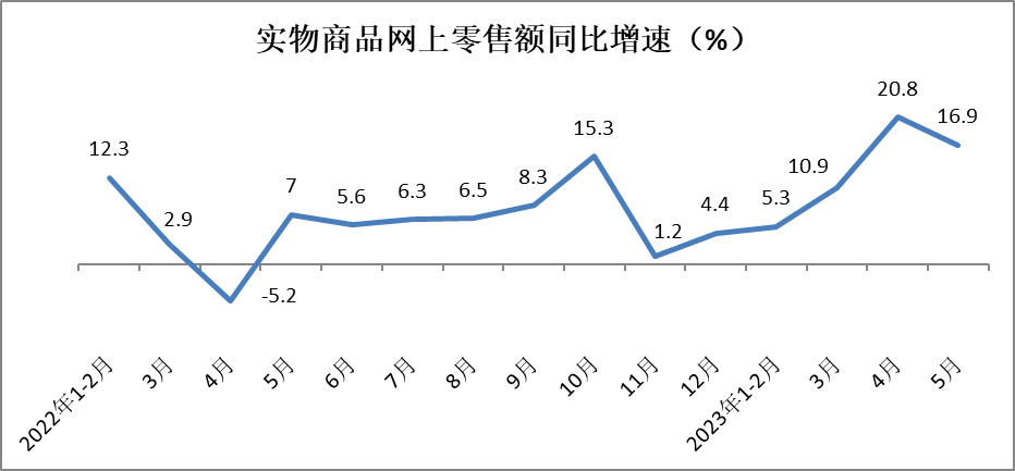 经测算,5月份,实物商品网上零售额同比增长16.9%,增速较4月份放缓3.9个百分点。1-5月份,实物商品网上零售额实现48055亿元,同比增长11.8%,增速较1-4月份加快1.4个百分点。1-5月份,实物商品网上零售额占社会消费品零售总额的比重为25.6%,占比较1-4月份提高0.8个百分点,也高于上年同期0.7个百分点。