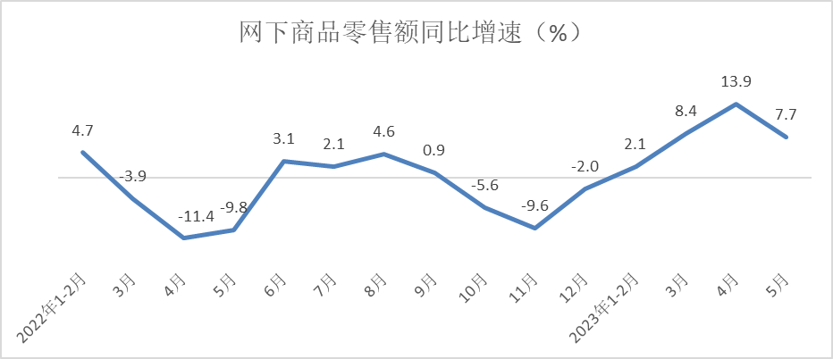 经测算,5月份网下商品零售额同比增长7.7%,增速较4月份回落6.2个百分点。1-5月份,网下商品零售额实现119623亿元,同比增长6.4%,增速较1-4月份加快0.2个百分点。