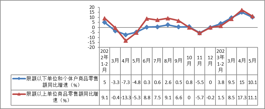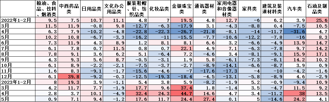 从商品类值看,5月份,限额以上单位通讯器材类、金银珠宝类、汽车类商品零售额同比分别增长27.4%、24.4%和24.2%,实现同比快速增长。服装鞋帽和针纺织品类、化妆品类商品零售额同比分别增长17.6%、11.7%,均实现较快增长。日用品类、中西药品类、家具类、石油及制品类、粮油食品和饮料烟酒类、家电类也均实现了正增长。建筑及装潢材料类、文化办公用品类商品零售额同比分别下降14.6%和1.2%,市场需求仍相对不足。