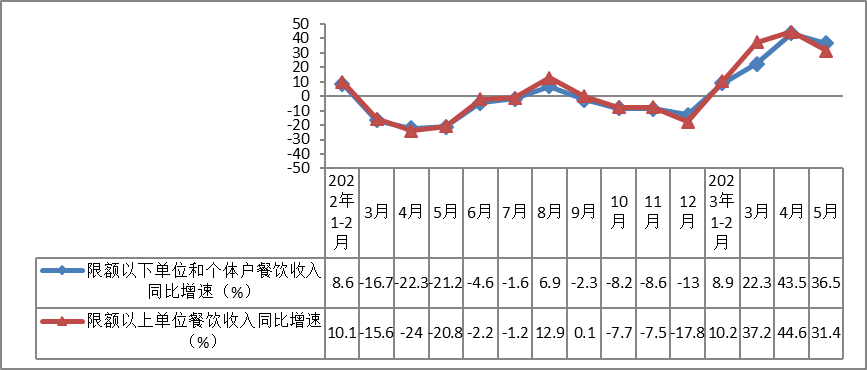 5月份,餐饮收入实现4070亿元,同比大幅增长35.1%,增速较4月份放缓8.7个百分点。1-5月份,餐饮收入实现19958亿元,同比增长22.6%,增速较1-4月份加快2.8个百分点。
