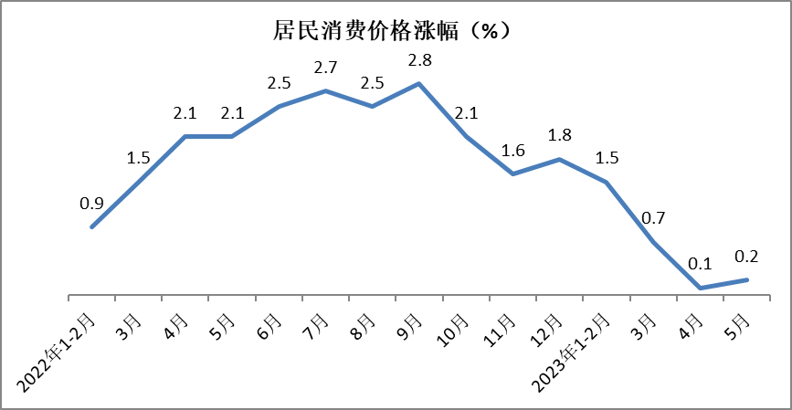 5月份,全国居民消费价格同比上涨0.2%,涨幅较4月份提升0.1个百分点。其中,食品类价格同比上涨1%,非食品类价格与同期持平,消费品类价格同比回落0.3%,服务类价格同比上涨0.9%。1-5月份,全国居民消费价格同比上涨0.8%,涨幅较1-4月份回落0.2个百分点。