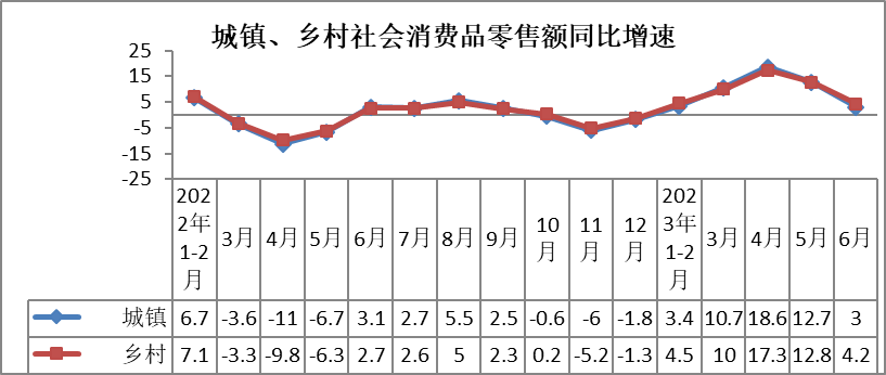 其中,6月份,城镇消费品零售额实现34563亿元,同比增长3%,增速较5月份放缓9.7个百分点;乡村费品零售额实现5388亿元,同比增长4.2%,增速较5月份放缓8.6个百分点。